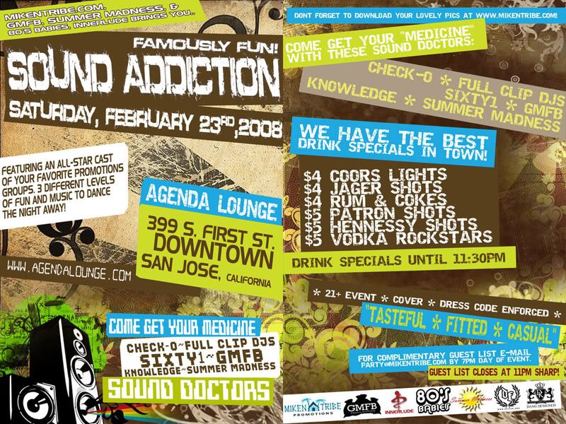 Saturday, an ALL NEW event at AGENDA LOUNGE, hosted in part by yours truly.. GMFB! hahah.. sound addiction is the name, and its all about music, and ya'll enjoyin it. come out, support GMFB, and come chill with me. hahaha.